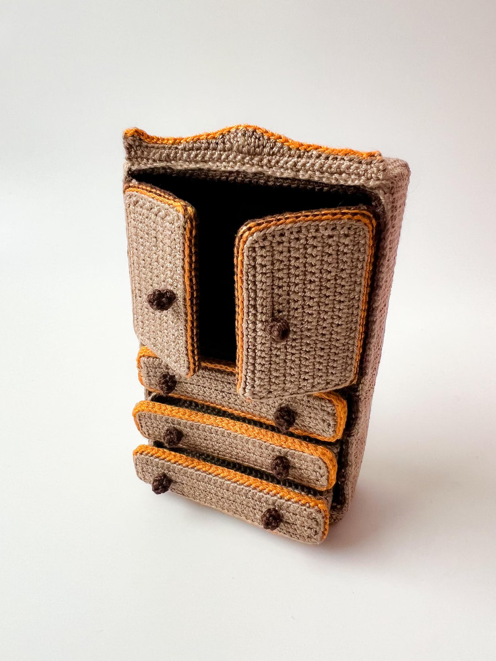 Designed to fit a 1:16 dollhouse, this crochet pattern includes step-by-step instructions to make a cozy couch, TV cabinet, and coffee table—a complete living room setup for your miniature world.