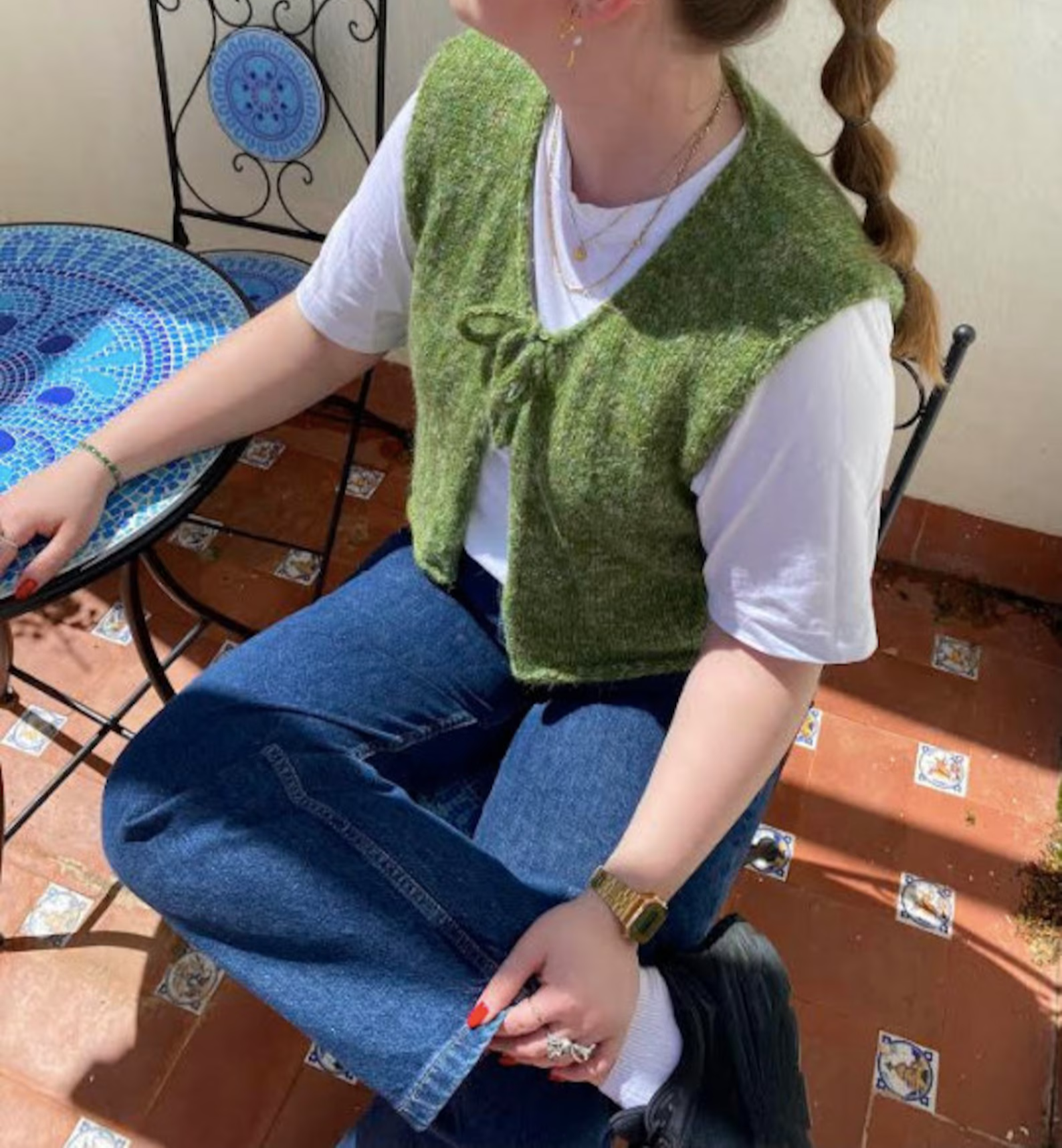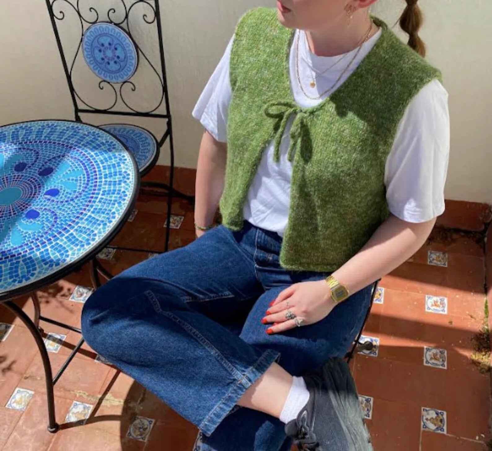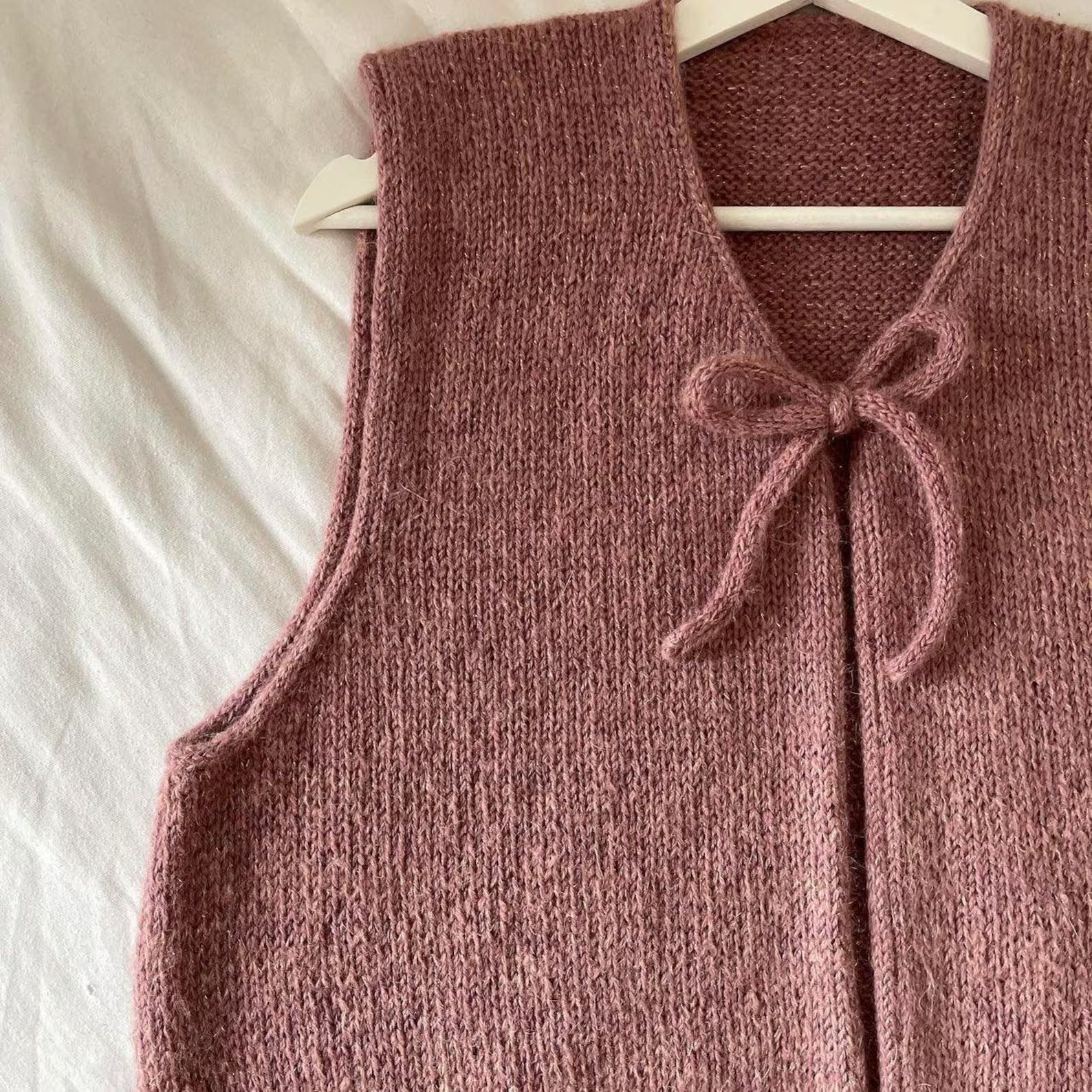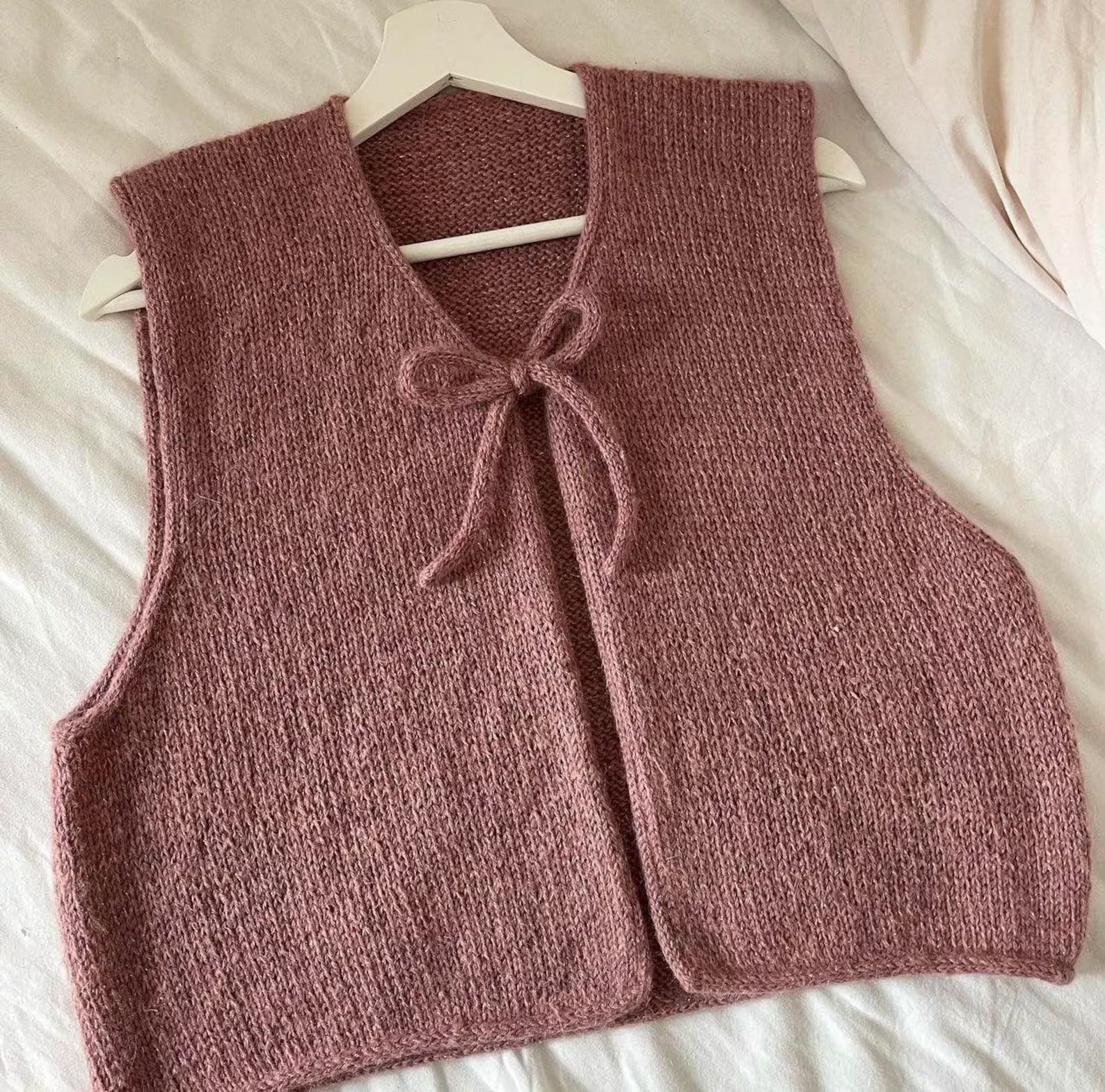 The Flora Vest Knitting Pattern is a feminine bow-tie closure, shimmering yarn, and soft alpaca feel, this vest is as delightful to knit as it is to wear. 💖